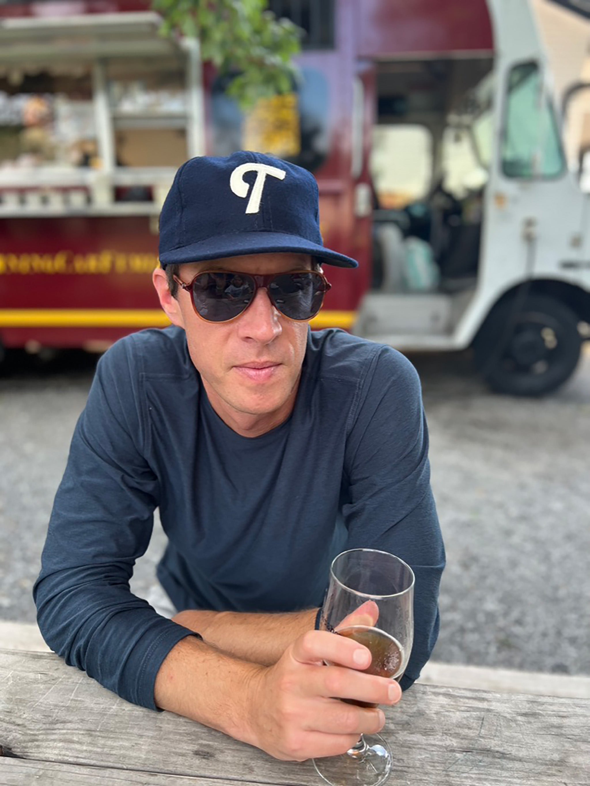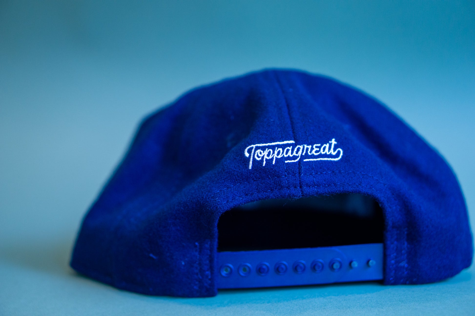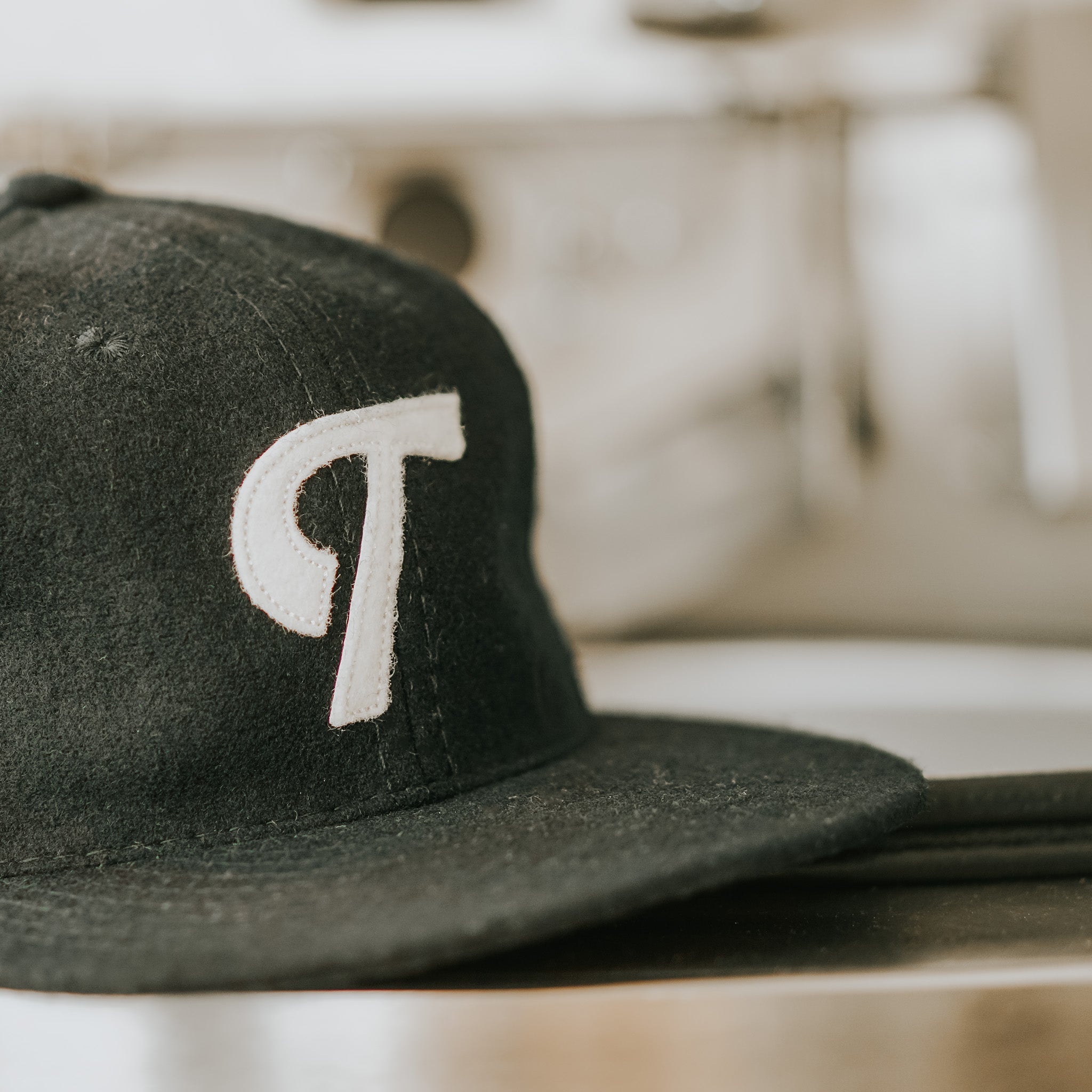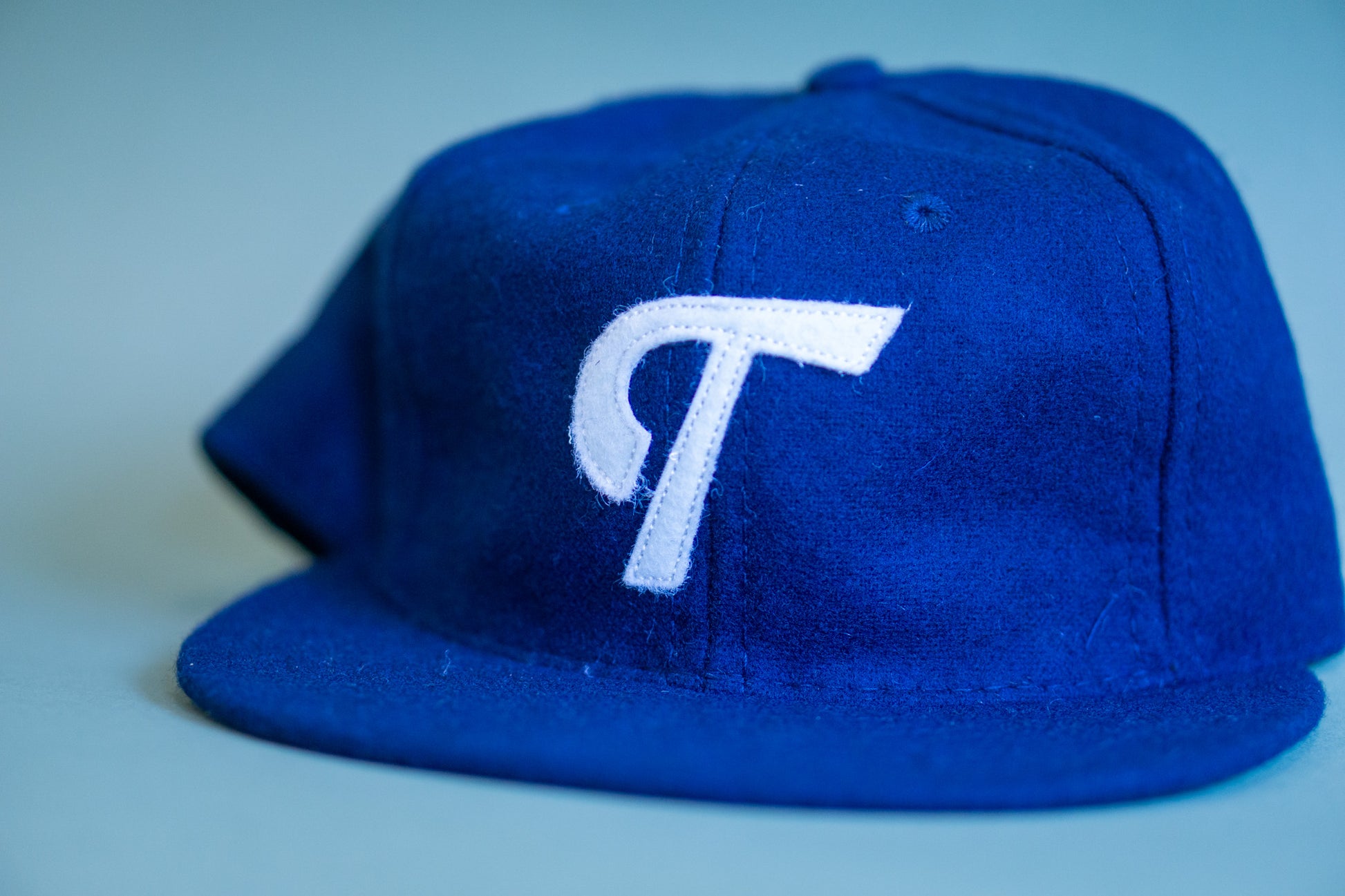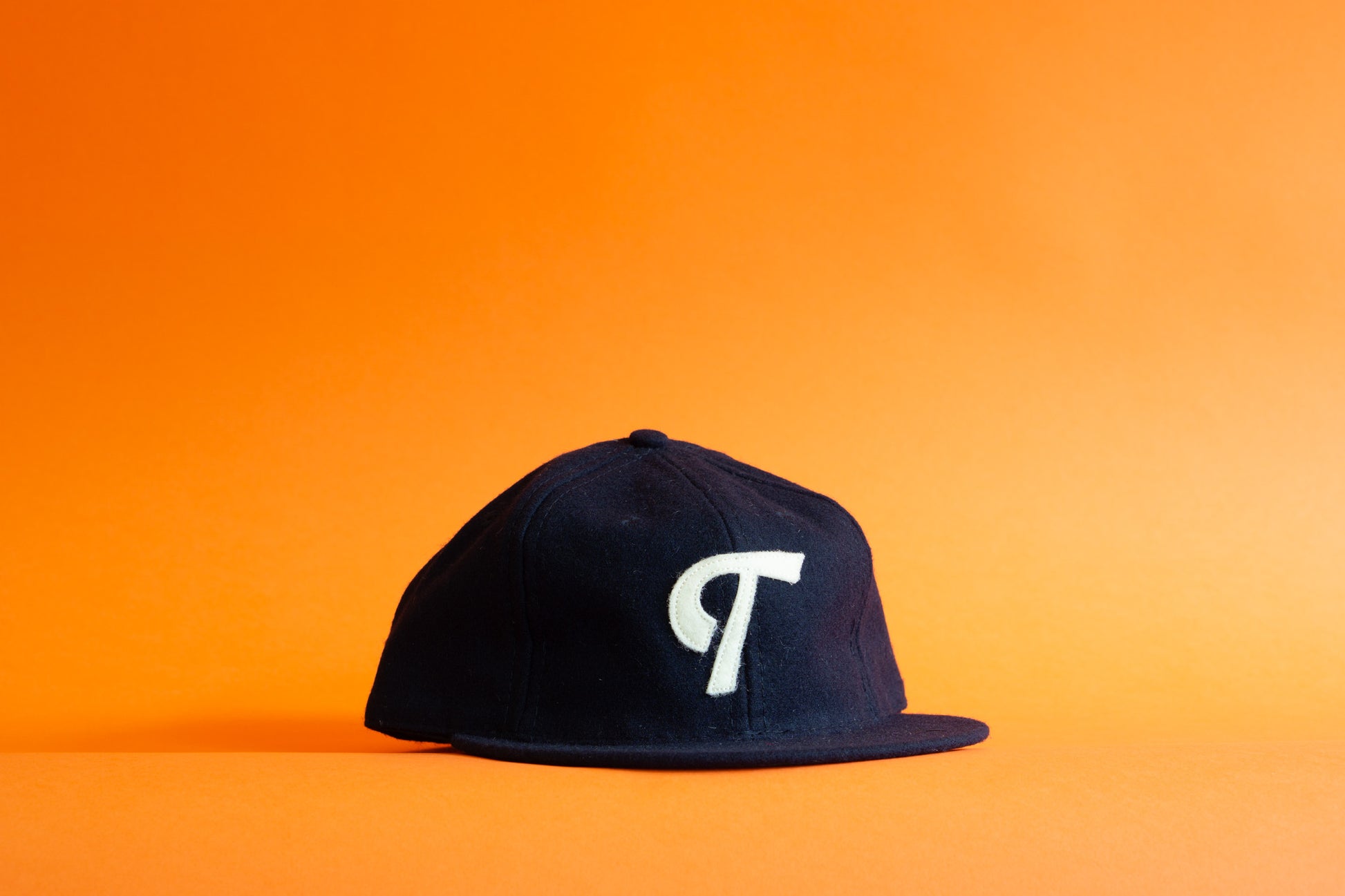The "T" cap is made from premium broadcloth wool with a snapback closure. Our monogram brand mark is featured in a vintage off-white and sewn onto a navy cap.